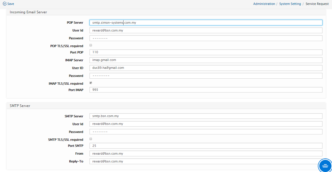 POP server to connect to for receiving emails sent into Loyalty System – Service Request module. Pop Server – IP of Email Server User Id – user id for account on Email Server Password – password for account on Email Server POP TSL/SSL – to use SSL with Email Server Port – port used to connect to Email server |