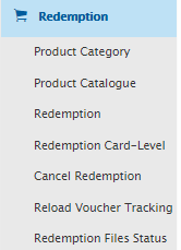 The Redemption menu is consisting of Product Category, Product Catalogue, Redemption, Cancel Redemption and Redemption Files Status. In the following sections, each sub menu will be explained.