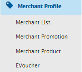 The Merchant menu consists of Merchant List, Merchant Category, Merchant Product, Merchant Request and eVoucher. In the following sections, each sub menu will be explained. The Merchant records will be shown in Customer Portal as Hot Deals, Promotions or Merchants. |