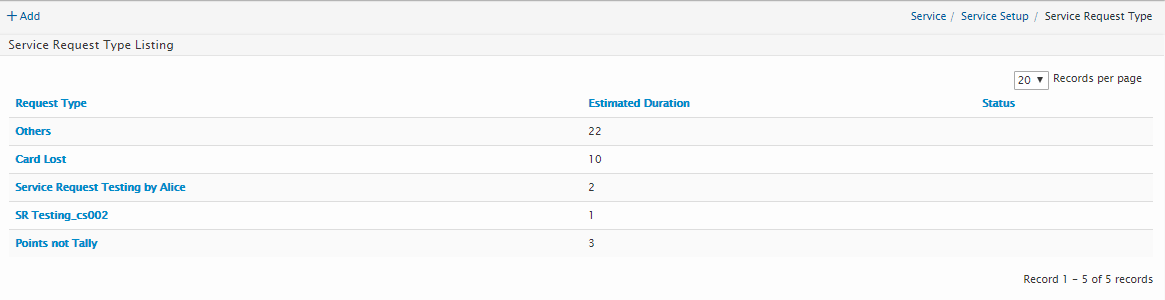 Users can view the details of the Service Request Type by clicking the Request Type on the first column of the page. Users can also add Service Request Type by clicking “Add” button.