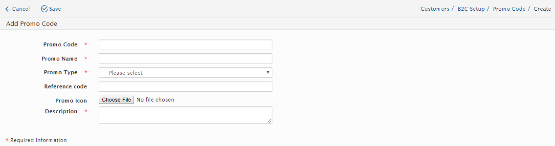 The user can click “Save” to save the information. Or click “Cancel” button to exit without saving the information and return to the Promo Code Listing page.