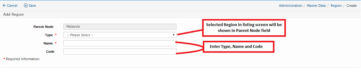 Click on the “Save” button to save the details or click on the” Cancel” button to cancel the action and return to Region page.
