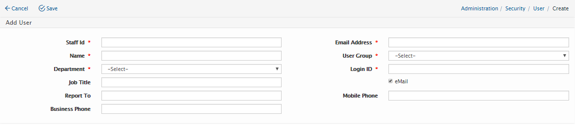 Click on “Save” button to save the details or click on “Cancel” button to cancel the action and return to User page.