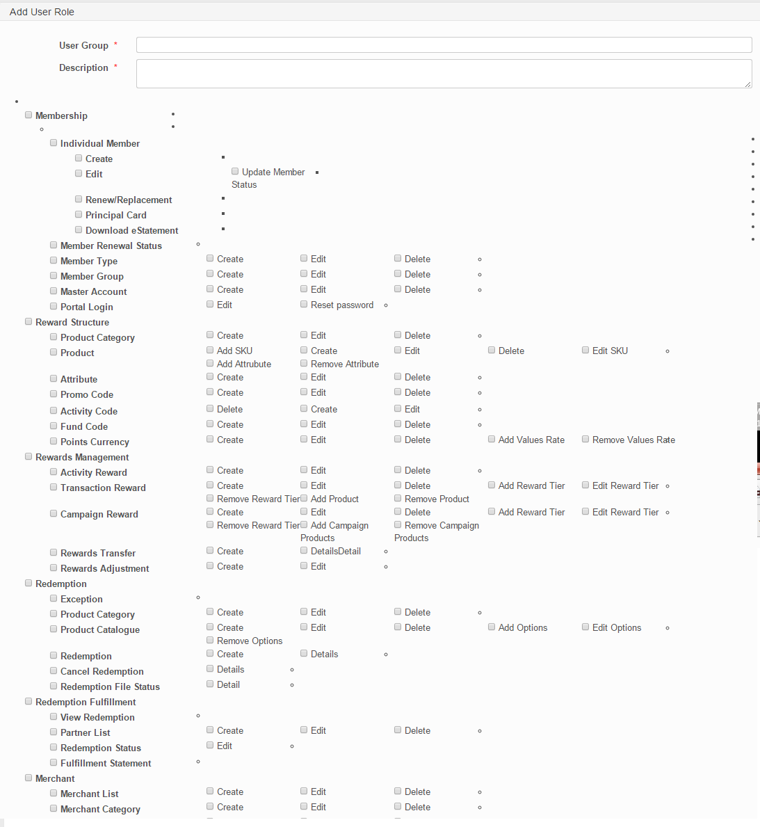 User needs to enter the User Role/Group Name, Description AND select the access rights of the User Role.