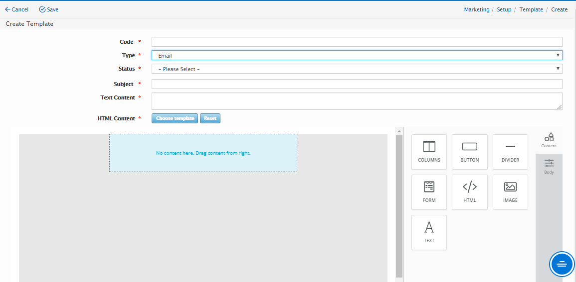 Go to Marketing Campaign > Template then click “Add” button. Users will need to enter the following details: