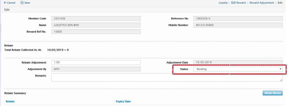 Search for the Corporate Rewards Adjustment just created at the Corporate Rewards Adjustment listing page. At the Corporate Rewards Adjustment listing page, click on the Adjustment that just created then change the status from “Pending” to “Approve”.