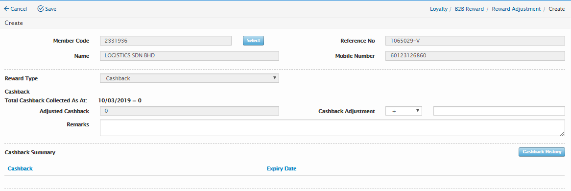 Users are able to add new Corporate Rewards Adjustment at this screen. Click on the “Add” button located on the top right-hand corner of the Corporate Reward Adjustment window. The Corporate Reward Adjustment window will be displayed as below.