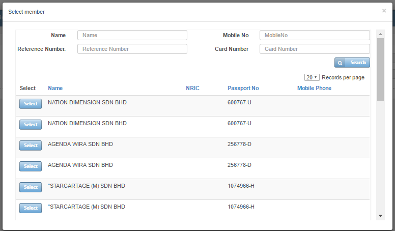 Users can search for the member via their Name, Mobile No, Reference No or Card Number or click on the “Search” button to list all the members that are in the system.