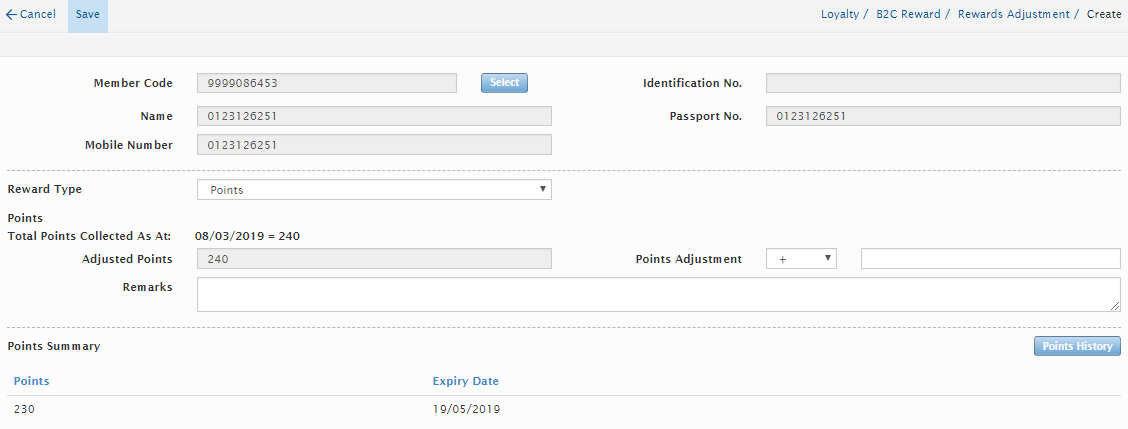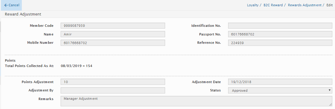 The Rewards Adjustment created has yet to be reflected into the member’s account at this stage. Search for the Rewards Adjustment just created at the Rewards Adjustment listing page.