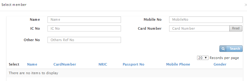 Users can search for the member via their Name, Mobile No, Identity No. or Card Number. Alternatively, users can just click on the “Search” button to list all the members that are in the system.