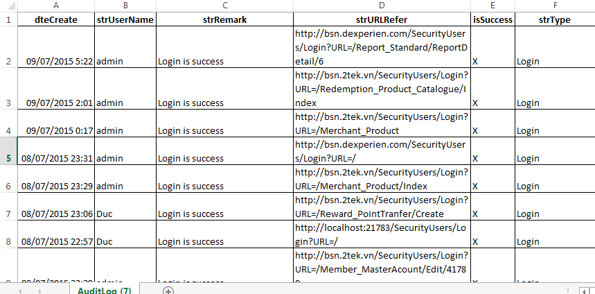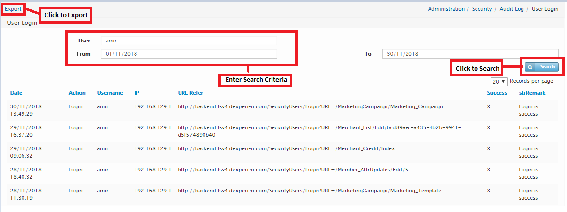 Click on Administration > Audit Log > User Login and users can see the Audit Login Listing page.