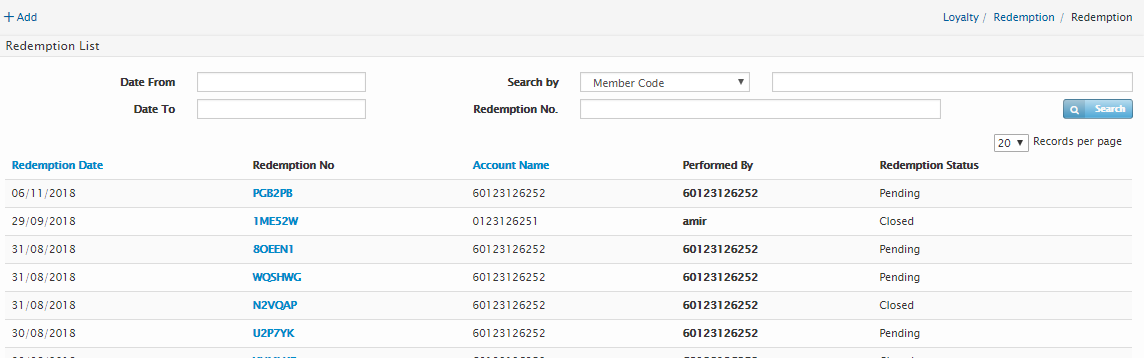 Users can search for the required Redemption item via by Redemption Date, Redemption No, Member Name, Member Code or Card Number. Click on the Redemption No. to view the Redemption details.