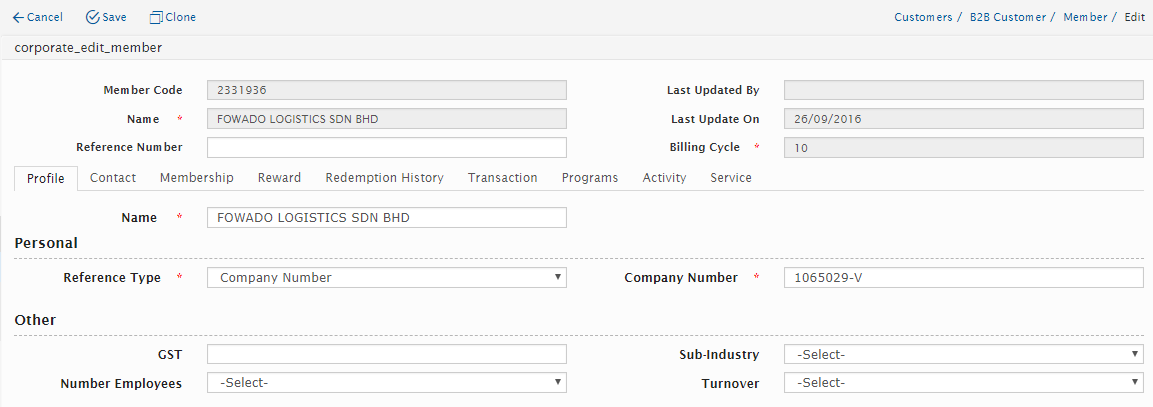To clone a Member, select the desired Member record to be cloned then click to open. Click on the “Clone” button at the top left-hand corner of the page and enter the new card number in the pop-up window then click “Save” button. Click “OK” button to confirm the creation of the Member and it will then navigate to Edit Member page.