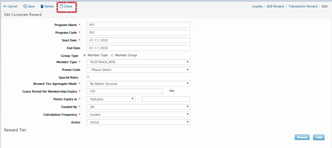 Users are able to clone the Corporate Customer Reward created. At the Corporate Customer Reward search page, select the Corporate Customer Reward then click on the Program Name to open. Click on the “Clone” button located on the top right-hand corner of the page.