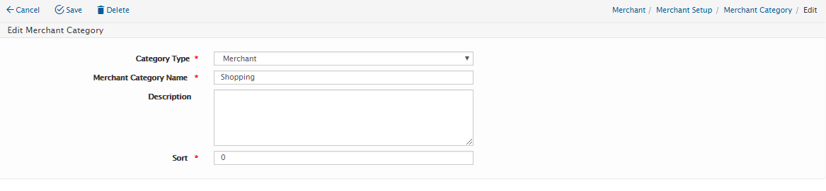 Users can edit a Merchant Category at this screen. Click on the first column of Merchant Category List records in the Merchant Category page. The Edit Merchant Category screen will be displayed as shown below