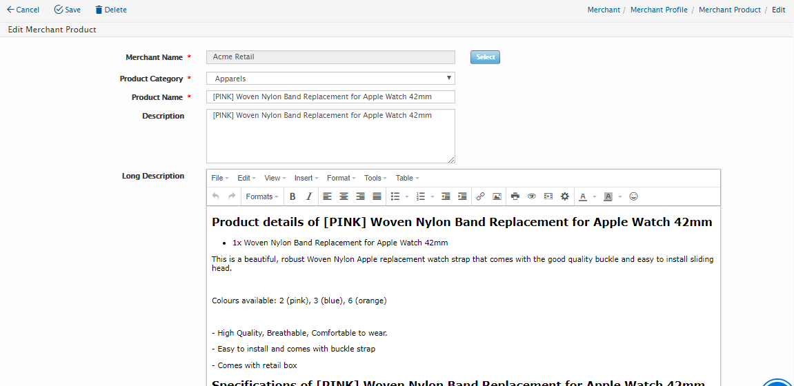 Users can edit a Merchant Product at this screen. Click on the second column of Merchant Product List records in Merchant Product page. The Edit Merchant Product screen will be displayed as shown below.