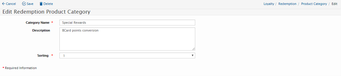 Users are able to edit the Redemption Product Category at this screen. Click on the first column in the Product Category Listing page. The Edit Redemption Product Category window will be displayed as shown below.