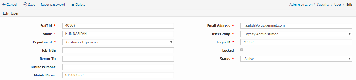 Users can edit a User at this screen. Click on the first column of User Listing records in User page. The Edit User screen is similar to the Add User page.