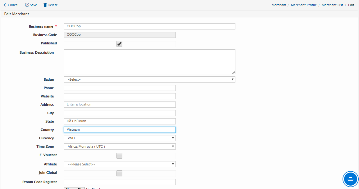Users can edit a Merchant at this screen. Click on the first column of Merchant List records in the Merchant page. The Edit Merchant screen will be displayed as shown below.