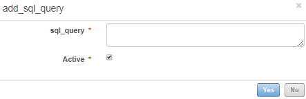To configure the SQL query section, click on “Add” button, Add SQL query window will be displayed as shown below. Enter the SQL query and tick on Active checkbox then click on “Yes” button. The SQL query will be added on the list.