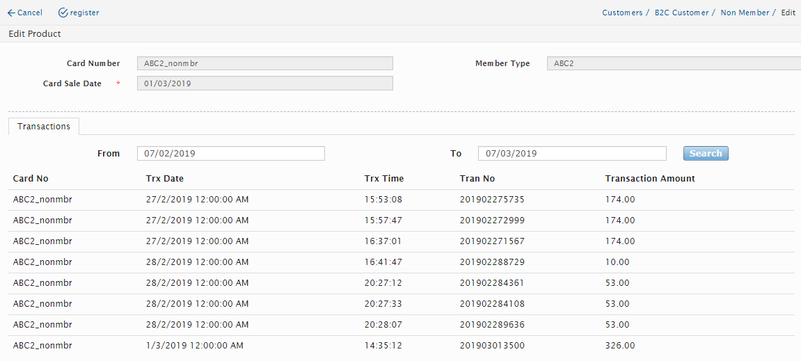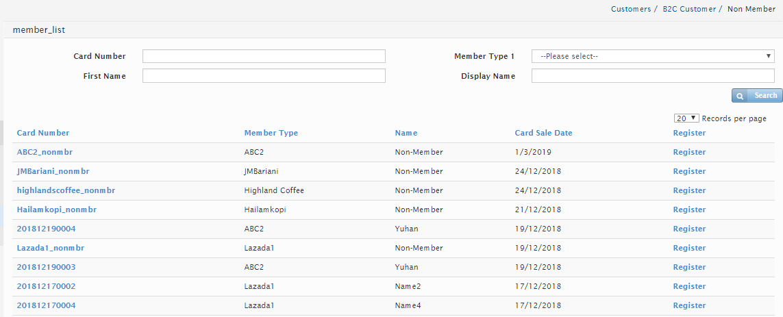 Also, the user has the option to register the card of a non-member and make a record. Click and open a non-member that you want to register. Then, click “Register” located at the top left-hand side of the page.
