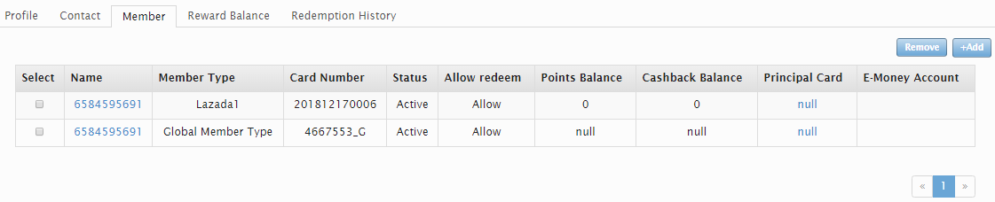 At the Member Tab, users can view all the cards and its member details under this Master Account. The users can also add or Remove cards under this page. To view the Member details of each card, click on the Name of the Member and it will redirect to Individual Member page.