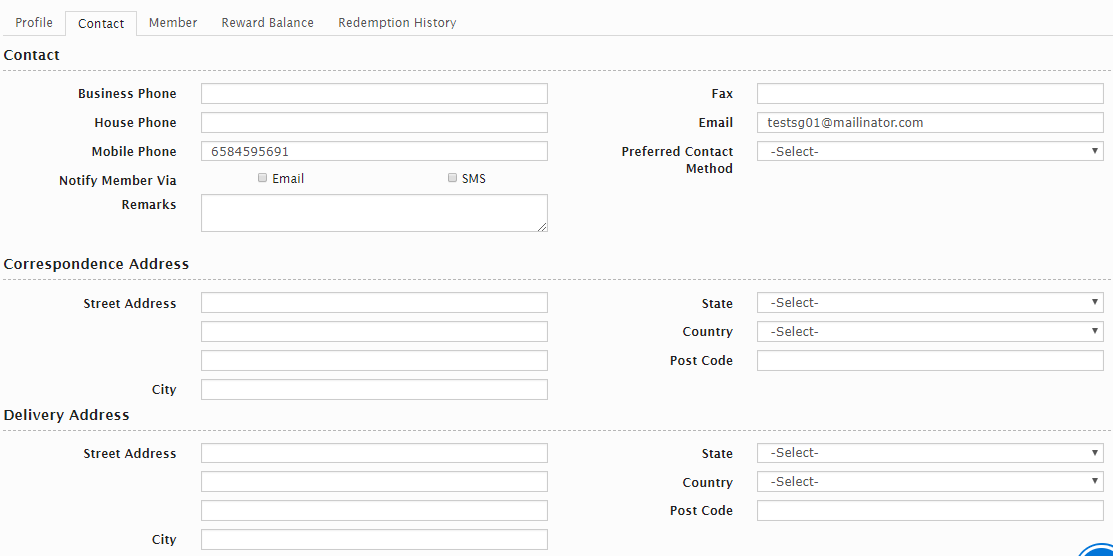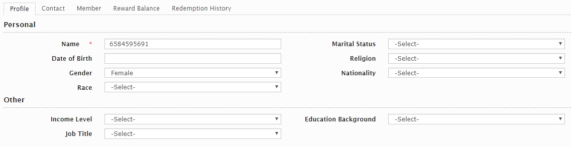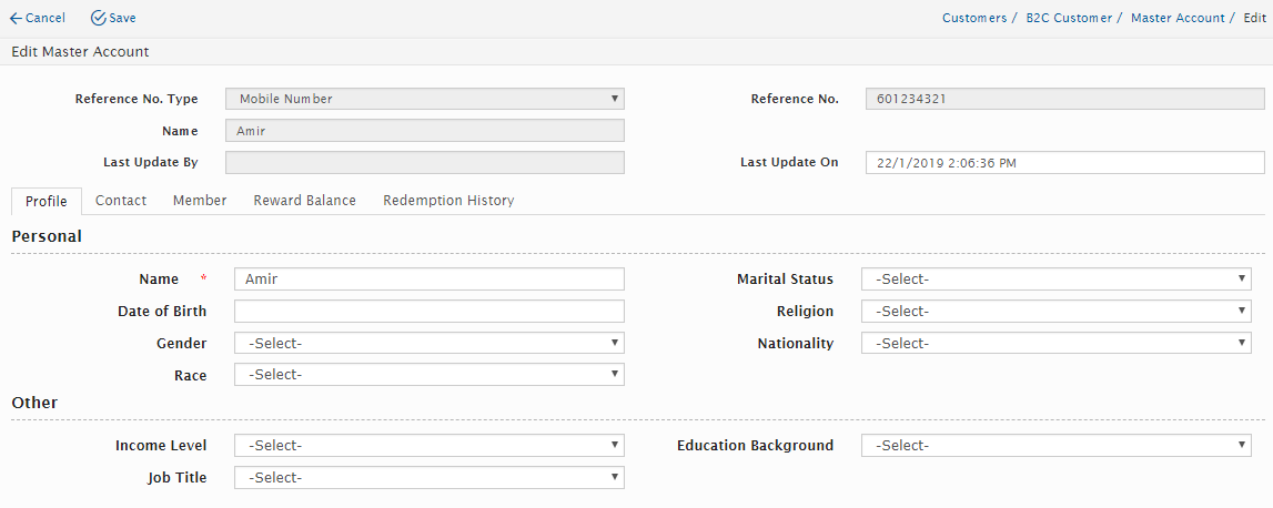 The Edit Master account screen is divided into 5 different namely: Profile, Contact, Member, Reward Balance and Redemption History.