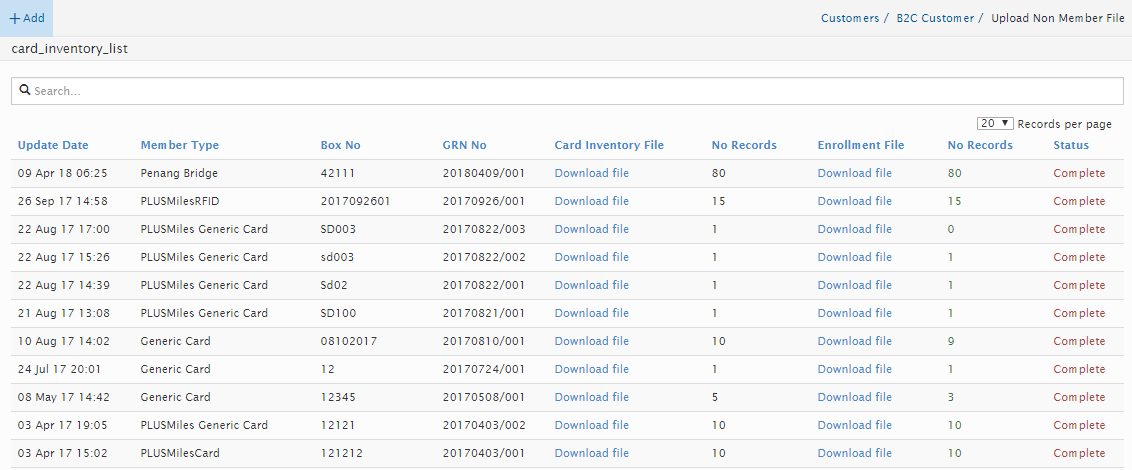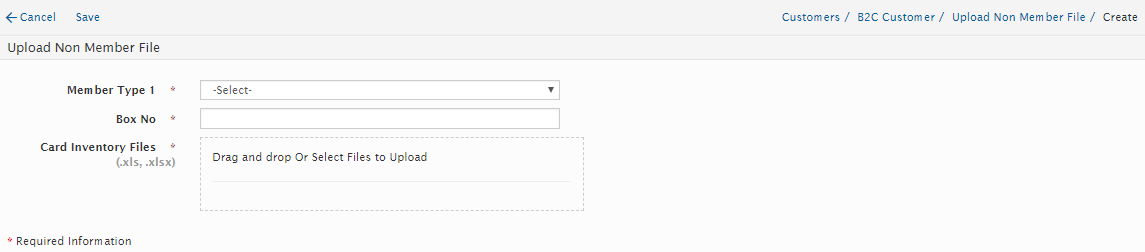The user allows uploading of non-member information via the Upload Non-Member module. Go to B2C Customer>Upload Non-Member File and click on Add button located at the top left-hand part of the page.