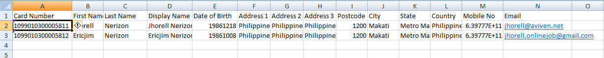 The uploading of the Card information will be done using the new DExperien file format wherein the user is allowed to upload name, address, mobile phone, email and etc information. See below format for reference.