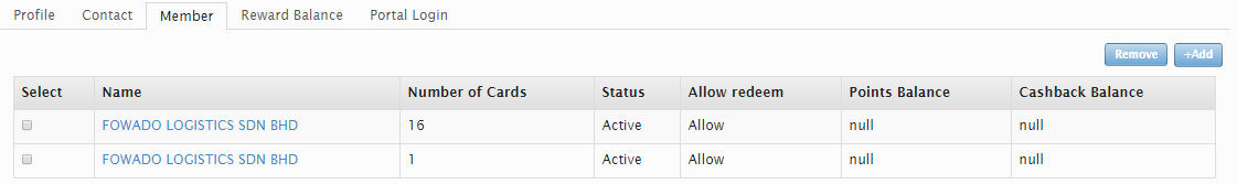 At the Member Tab, users can view all the cards and its member details under this Master Account. The users can also Add or Remove cards under this page. To view the Member details of each card, click on the Name of the Member and it will redirect to Individual Member page.