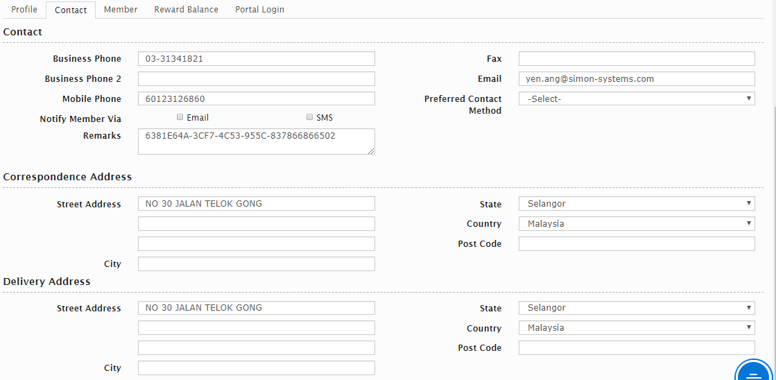 The Edit Master account screen is divided into 5 different namely: Profile, Contact, Member, Reward Balance and Redemption History.
