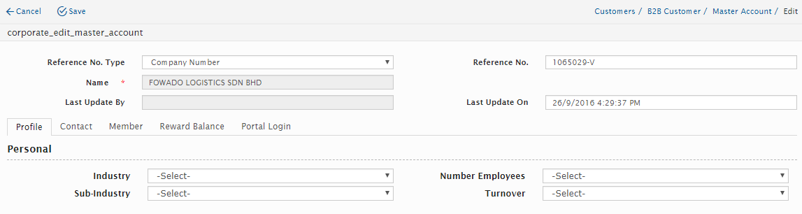 Users are able to edit a Master account from this page. To edit a Master Account, select the desired Master Account to be modified then click on the Reference No. in the Master Account Listing page. The Edit Master Account page will be displayed as shown below.