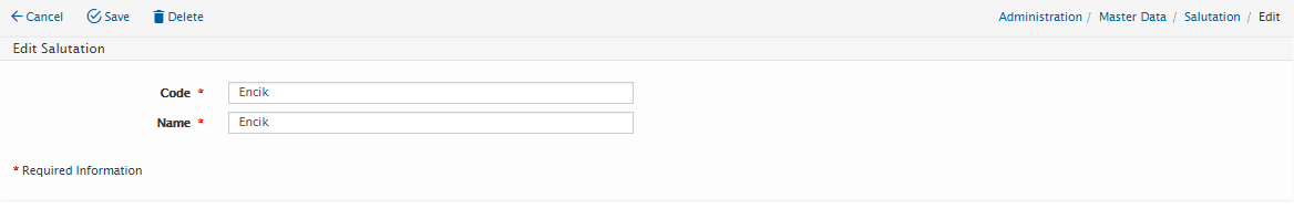 Users can edit the Salutation at this screen. Click on the first column of Salutation Listing records in Salutation page.