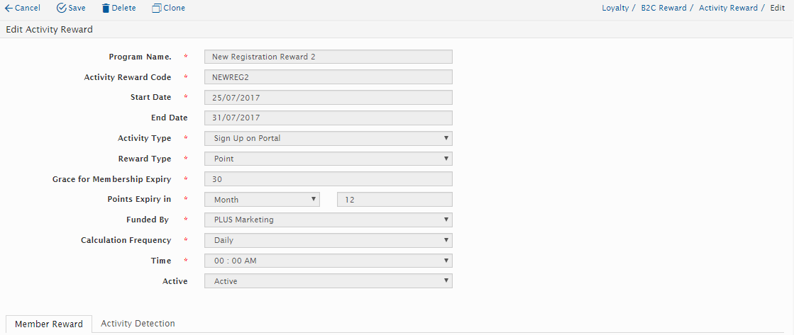 Users can only edit the Activity Reward when the Activity is not active. If the Activity Reward is active, users are only able to edit the end date of the Activity Reward.