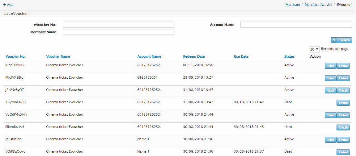 Users can click on “Used” button to mark the e-Voucher that it was redeemed and has been used. Users can click on “Detail” button to view the details of the e-Voucher.