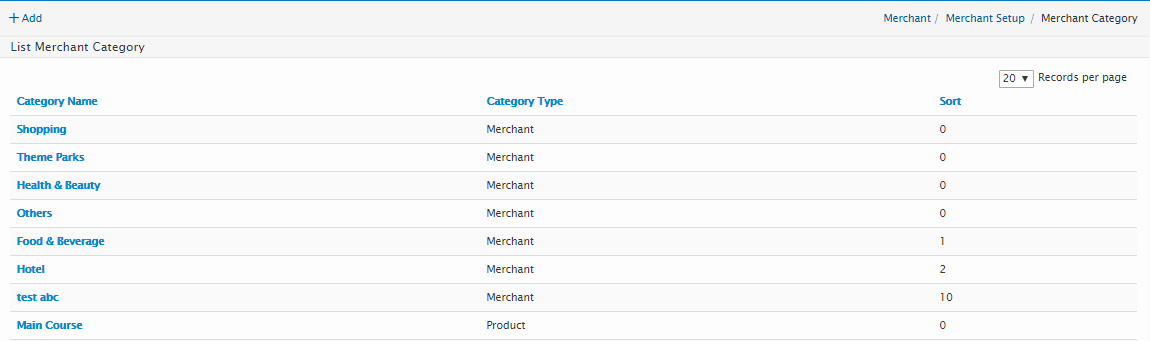 Click on the Merchant Category menu and it will list all Merchant Categories. The users can either Edit or Add Merchant Categories at this page.