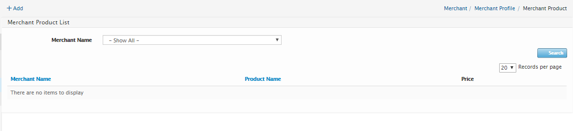 Click on second column (Product Name) in listing to view the merchant product details. Click on “Add” button to add a new merchant product.