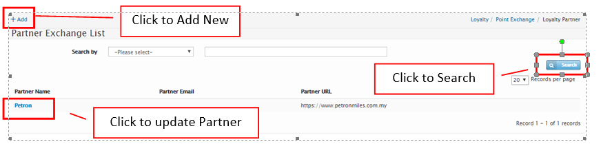 Click on the Partner List menu and users are able to search for partners in the system. Users can search by Partner Name or Email.