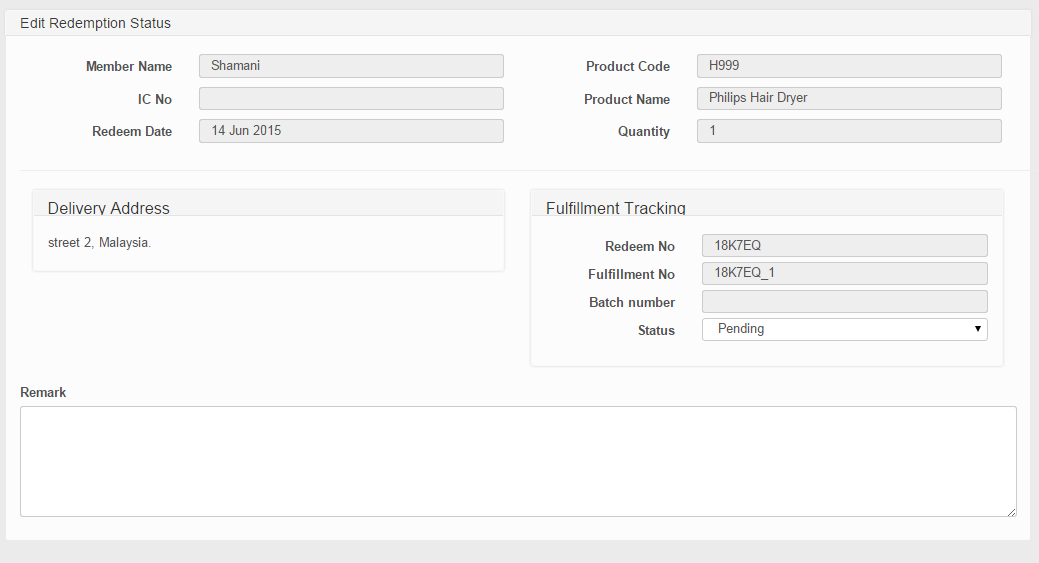 User can change the Status to the following values In Progress –packing/processing in progress Cancelled – Redemption item cancelled Shipping - Product is being shipped Delivered – Product successfully delivered |