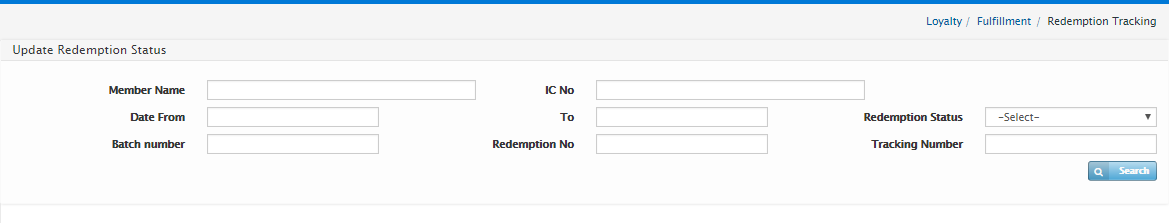 Click on the Redemption Status menu and users can search for the redemption product items that can be updated. User can search by Member Name, IC No, Redemption Date, Redemption Status, Batch Number, Redemption Number and Tracking number. Click on the “Search” button to search for a record.