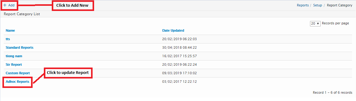 Click on first column in the listing page to edit the Report Category. Click on Add button to add a new Report Category.