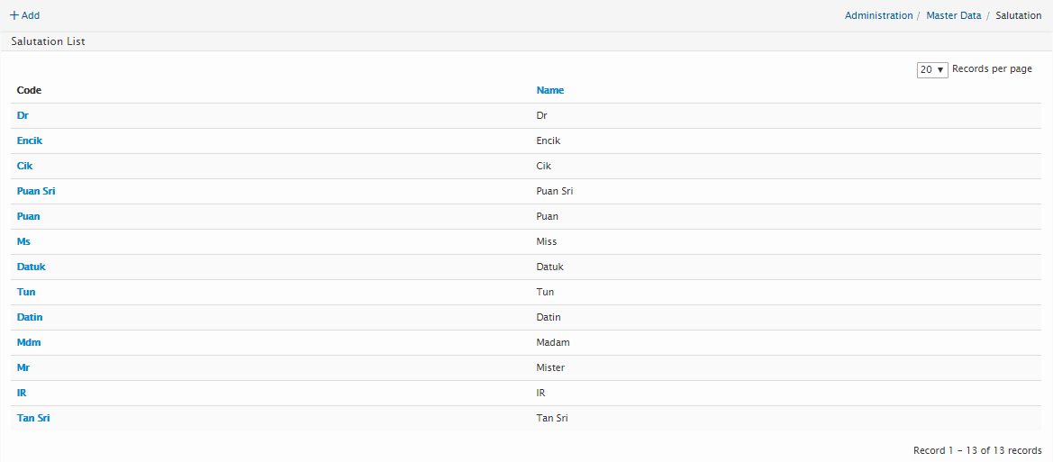 Click on the Administration >Master Data >Salutation page and users are able to see the list of Salutation.
