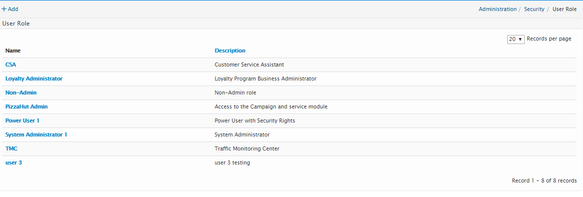 Users can click the Name of the User Role to view or update the details of User role. User can click on the “Add” button to add new User Role.