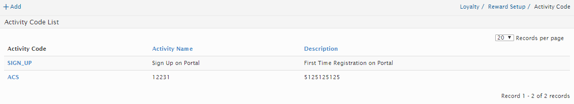 Click on the Activity Code page and by default the system will list all the Activity Code saved in the Loyalty System.