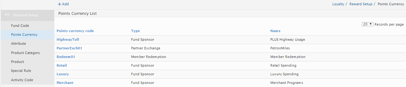 By default, when the user clicks on the Point Currency, the whole list of Point Currency will be displayed as shown below. Users are able to either add or edit the records.