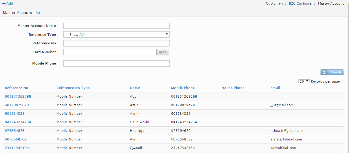 To search for a Master Account, go to B2C Customer > Master Account, the Master Account list page will be displayed. The users are able to search via by Member Name, Type, Reference Number (IC No, Passport Number, Army no and etc), Card Number, Mobile Number or Email.