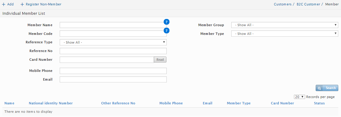 The users can search for a specific Member in the system via by Member Name, Member Code, Reference No., Card Number, Mobile Number, Member Group, Member Type, Email or Membership.