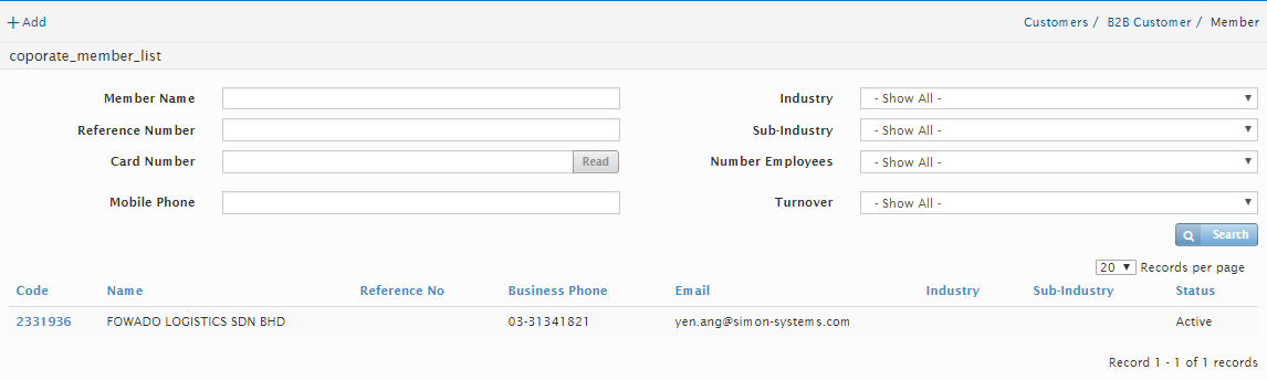 The users can search for a specific Member in the system via by Member Name, Industry, Reference Number, Sub Industry, Number of Employees, Mobile Phone and Turnover.