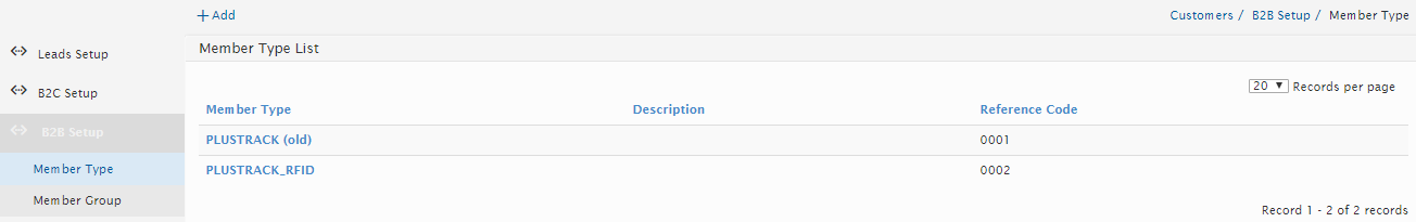 Users can search for a Member Type by navigating to Customer>B2B Set up > Member Type. On this page, the Member Type List is shown.