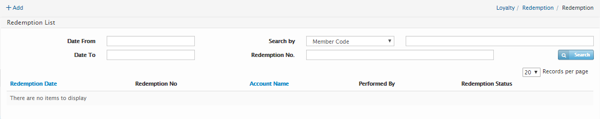 Click on the Redemption sub-menu and users are able to search for any redemption requests made in the system. Users can search by Redemption Date, Redemption No, Member Code, Member Name or Card Number.